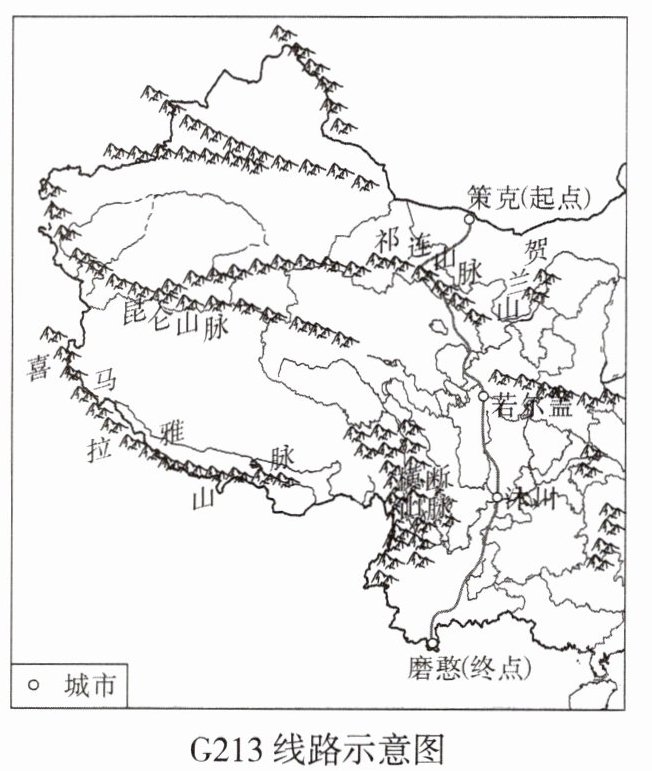 G213 是贯穿中国南北的西部大道,全程约 4136 千米。2024 年 9 月,某车队从策克一路向南奔向磨憨。读 G213 线路示意图,回答 6、7 题。