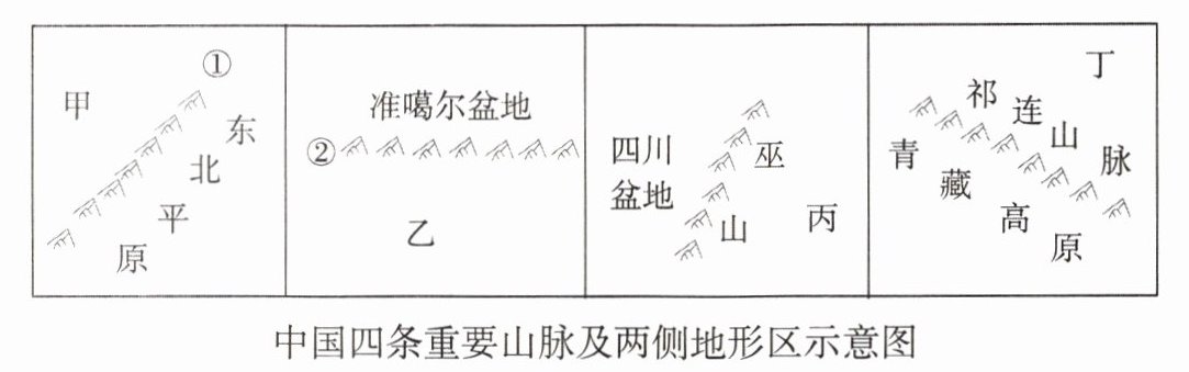 山脉构成我国地形的“骨架”。读中国四条重要山脉及两侧地形区示意图,回答 1、2 题。