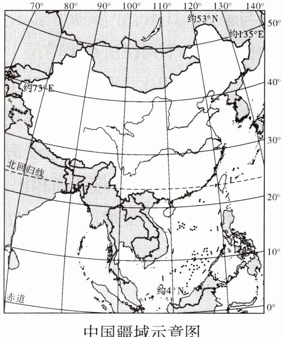 (1)根据右图中我国领土四至点的经纬度位置提示,写出我国领土四至点:最北端在