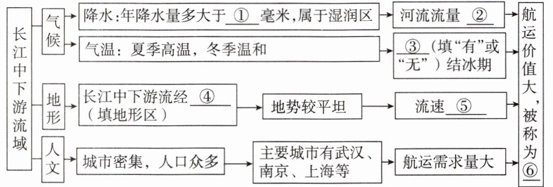 4. 长江是我国航运价值最大的河流。请分析长江中下游航运价值大的原因,补全下图。