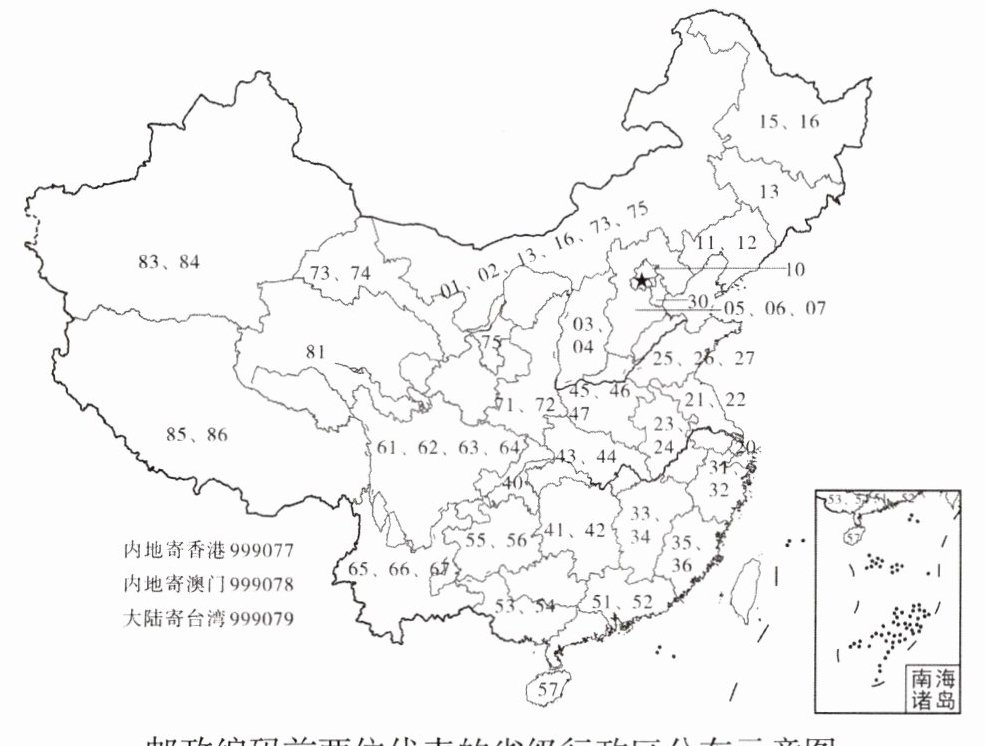 邮政编码是一个国家或地区为实现邮件分拣自动化和邮政网络数字化,加快邮件传递速度,而对全国进行划分的编码方式。邮政编码的前两位数字代表省(自治区、直辖市)。读邮政编码前两位代表的省级行政区分布示意图,回答 3、4 题。