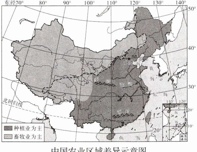 1. 读中国农业区域差异示意图,图中我国东部农区和西部牧区的分界线与