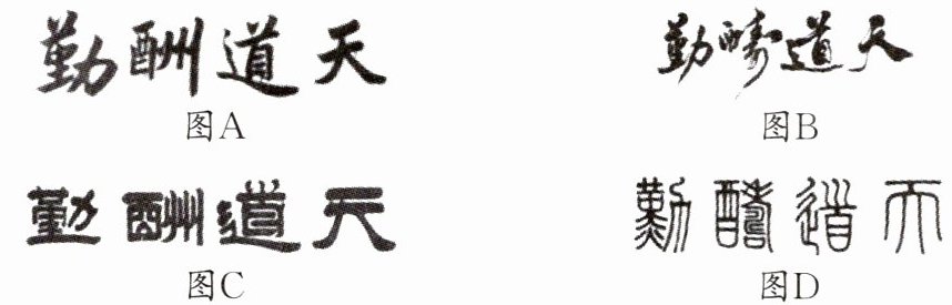 ,理由:图A是楷体,形体方正,笔画平直,规矩端正,与“天道酬勤”所倡导的脚踏实地、积极拼搏的精神相符