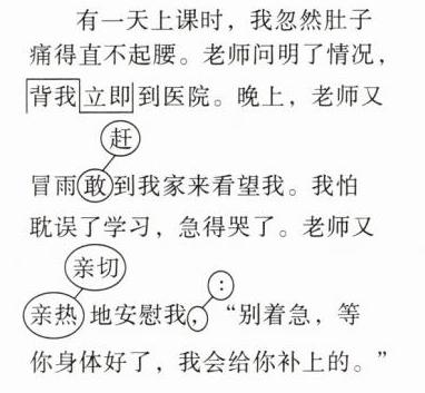 有一天上课时,我忽然肚子痛得直不起腰。老师问明了情况,背我立即到医院。晚上,老师又冒雨敢到我家来看望我。我怕耽误了学习,急得哭了。老师又亲热地安慰我,“别着急,等你身体好了,我会给你补上的。”