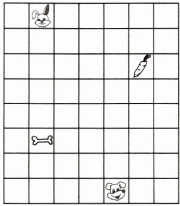 小兔子先向右平移4格,再向下平移2格就可以吃到胡萝卜(也可以先向下平移2格,再向右平移4格);小狗先向上平移2格,再向左平移3格就可以吃到骨头(也可以先向左平移3格,再向上平移2格)。