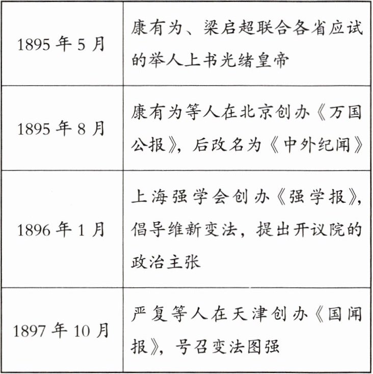 (1)公车上书;维新派人士在全国各地组织学会,创办报刊,推动维新思想广泛传播;主张开议院,号召变法图强。(任答2点即可)