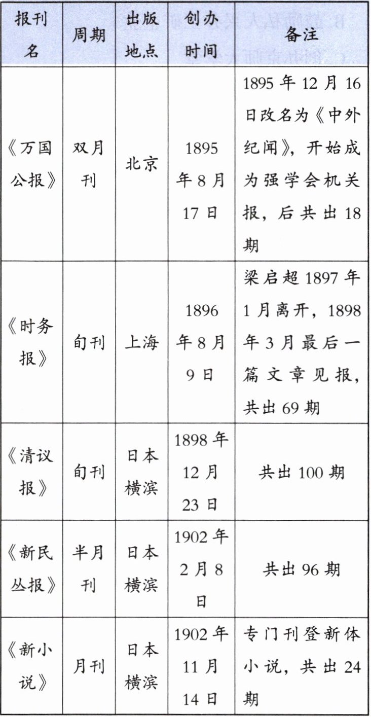 (1) 在梁启超创办的刊物中,推动了维新变法思想的广泛传播且影响巨大的是哪个?