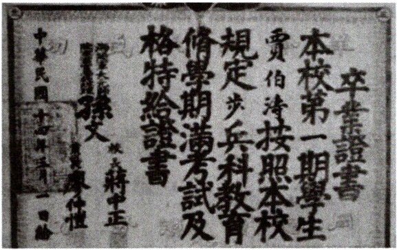 信息:中华民国十四年、孙文、廖仲恺、蒋中正。证明:中华民国十四年是1925年。1924年国民党一大的召开标志着第一次国共合作实现。第一次国共合作期间,孙中山在广州黄埔创办中国国民党陆军军官学校,又称“黄埔军校”。孙中山兼任军校总理,廖仲恺任党代表,蒋介石任校长,周恩来不久后担任政治部主任。