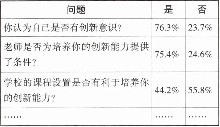 (2)①多数中学生有创新意识。②老师较注重培养学生的创新能力。③学校的课程设置在培养学生的创新能力方面还有欠缺。