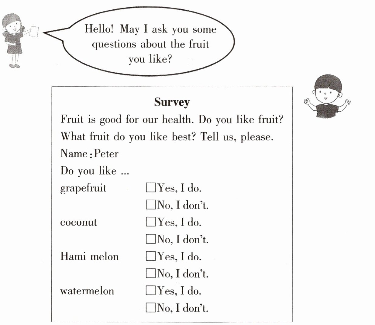 二、Listen and tick. 听朗读,根据对话内容判断 Peter 是否喜欢调查问卷中的水果,并在问卷相应位置画“√”。