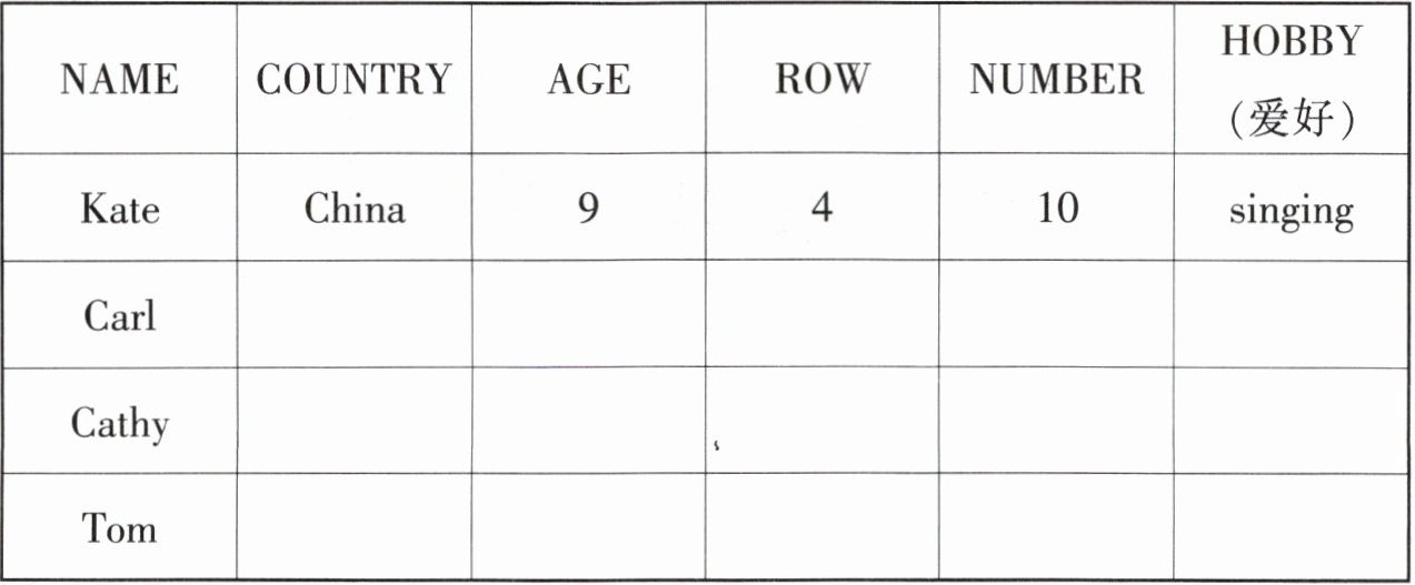 | NAME | COUNTRY | AGE | ROW | NUMBER | HOBBY (爱好) |
