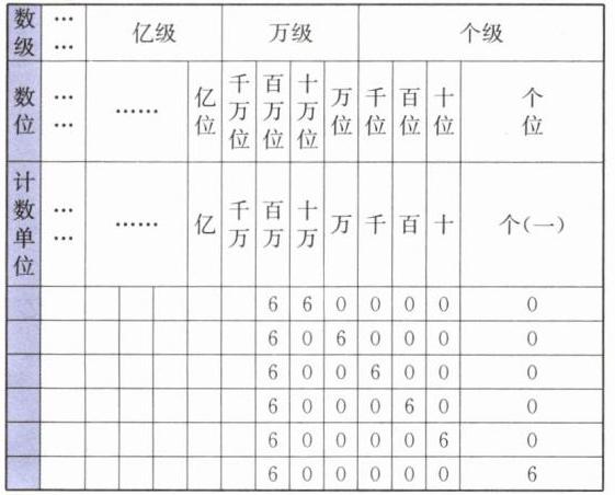1. 6060000,6000600,6000060,6000006 2. 6600000,6006000 3. 6600000,6个百万,6个十万 4. 599994 5. 略