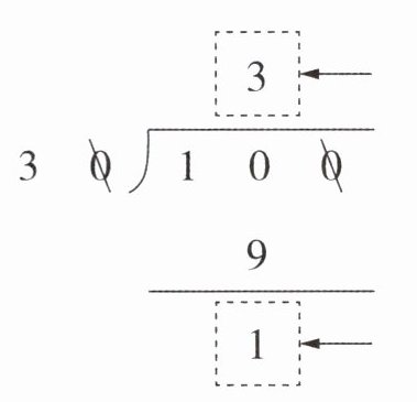 2. 王奶奶包了 $100$ 个水饺,如果每 $30$ 个装一盒,可以装满几盒?还剩几个?下面竖式中箭头所指的部分表示(