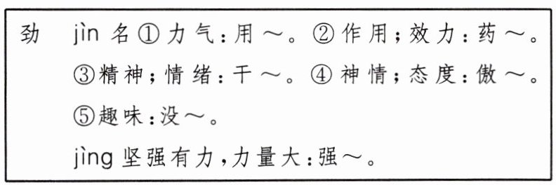 1. 请根据《现代汉语词典》(第7版)中“劲”的词条,给下面加点的字注音、释义。(2分)