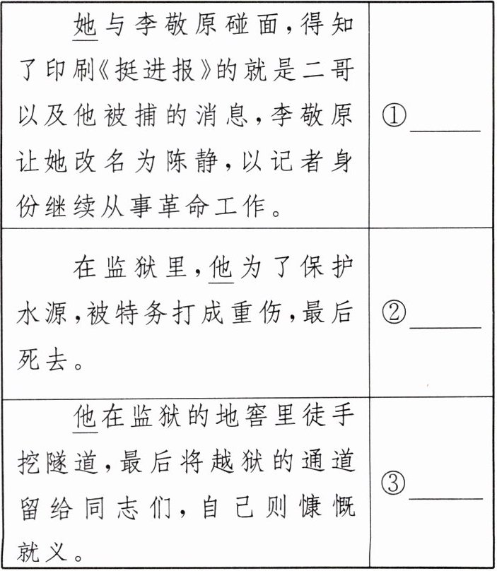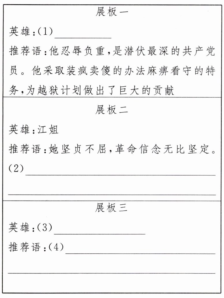 11. 《红岩》是一部用烈士鲜血写成的英雄史诗,书中塑造了众多革命战士的英雄群像,请你为“红岩馆”补充完善以下三块展板的内容。