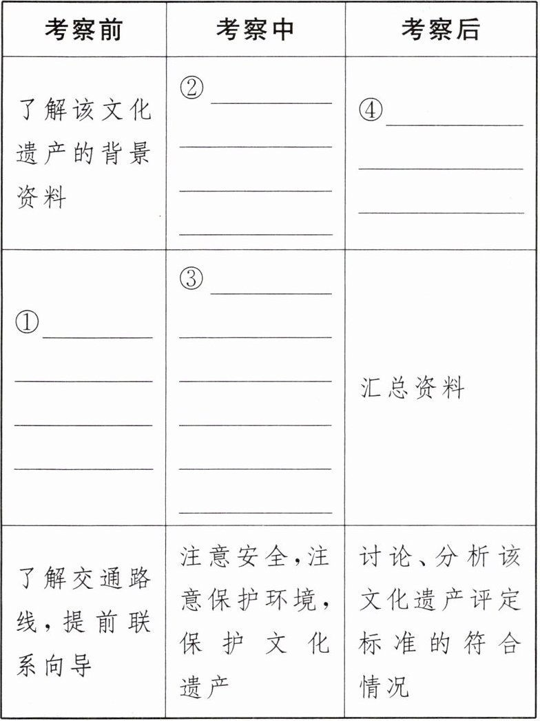 2. 撰写《优秀文化遗产申请报告》需要实地考察,搜集资料。如果要让你进行这方面的工作,你有什么样的计划?请按考察前、考察中、考察后三个方面填写表格。