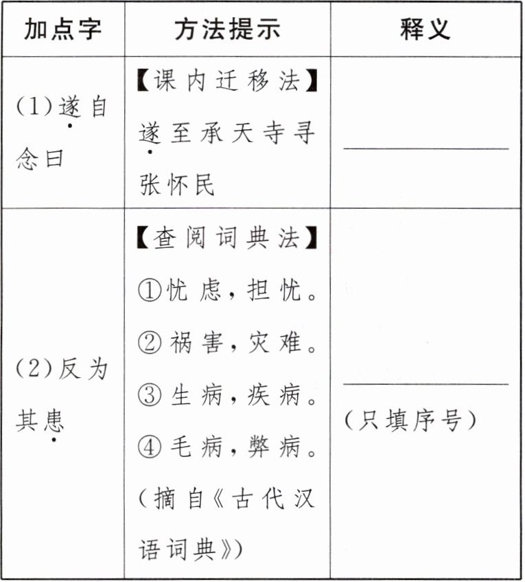 15. 请根据下面表格中的“方法提示”,解释加点字的意思。(2分)