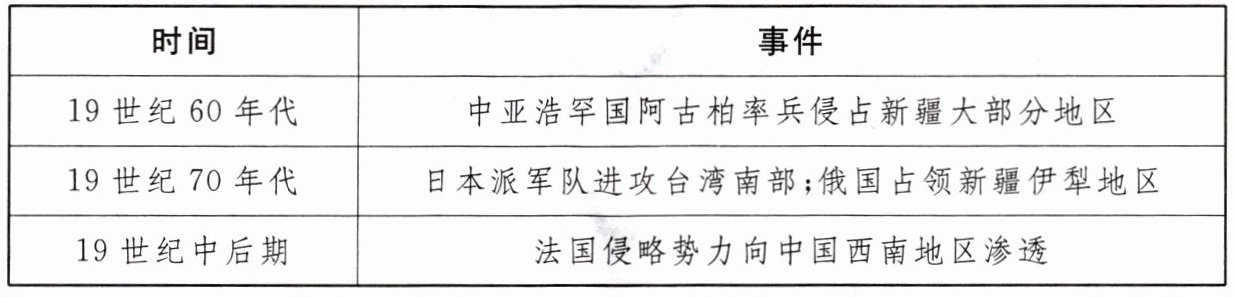 (3)在两次鸦片战争的外来冲击之下,清政府为自救而发起洋务运动,说明中国近代社会变化受到外力的冲击。洋务运动前期,主张学习西方的技术,创办军事工业,之后逐渐发现问题,开始开办民用企业,体现中国近代是动态变化。(符合题意即可,4分)