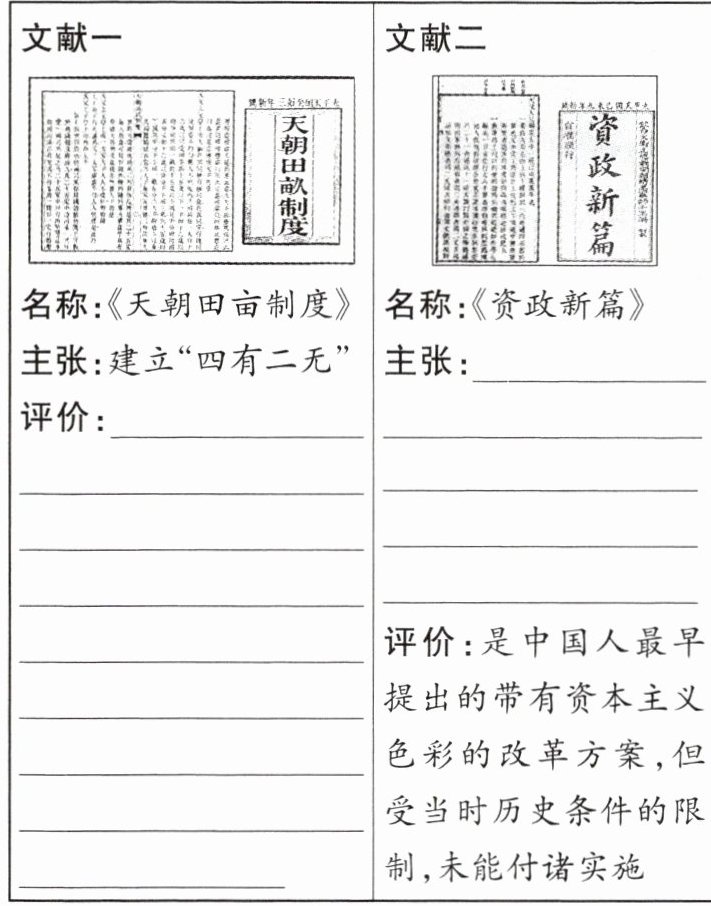 | 名称:《天朝田亩制度》主张:建立"四有二无"评价:______ | 名称:《资政新篇》主张:______评价:是中国人最早提出的带有资本主义色彩的改革方案,但受当时历史条件的限制,未能付诸实施 |