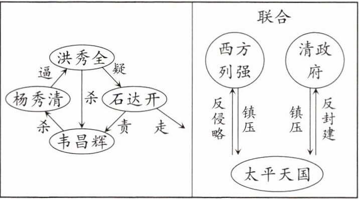 (3)太平天国运动失败的标志是什么?根据下面示意图,分析太平天国运动失败的原因。(3分)
