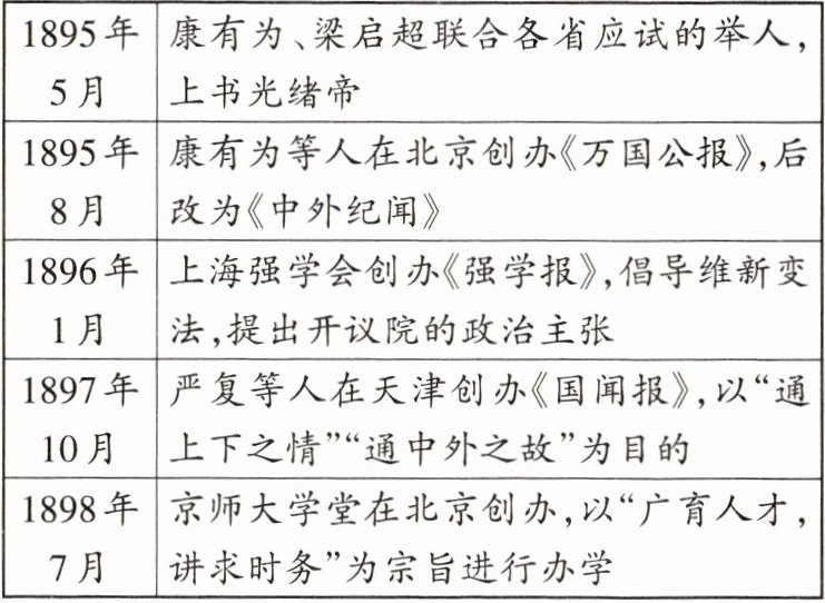 (2)措施:发起“公车上书”;创办报刊;组织学会,宣传变法思想;开办新式学堂。(答出任意一点得1分,共2分)
