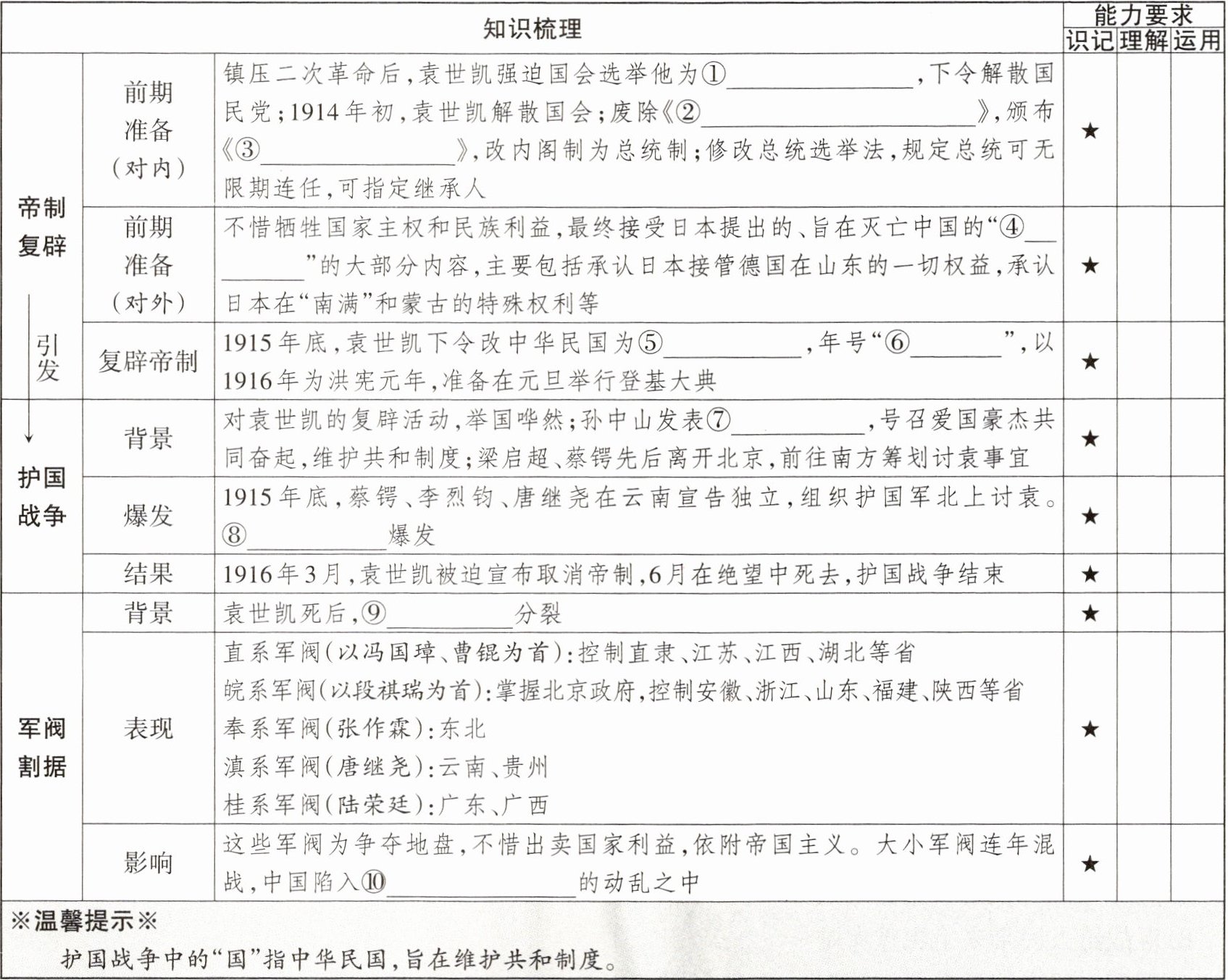 | |复辟帝制|1915年底,袁世凯下令改中华民国为⑤______,年号“⑥______”,以1916年为洪宪元年,准备在元旦举行登基大典|★| | |