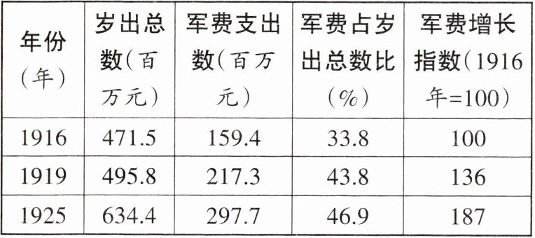 | 年份(年) | 岁出总数(百万元) | 军费支出数(百万元) | 军费占岁出总数比(%) | 军费增长指数(1916年= 100) |