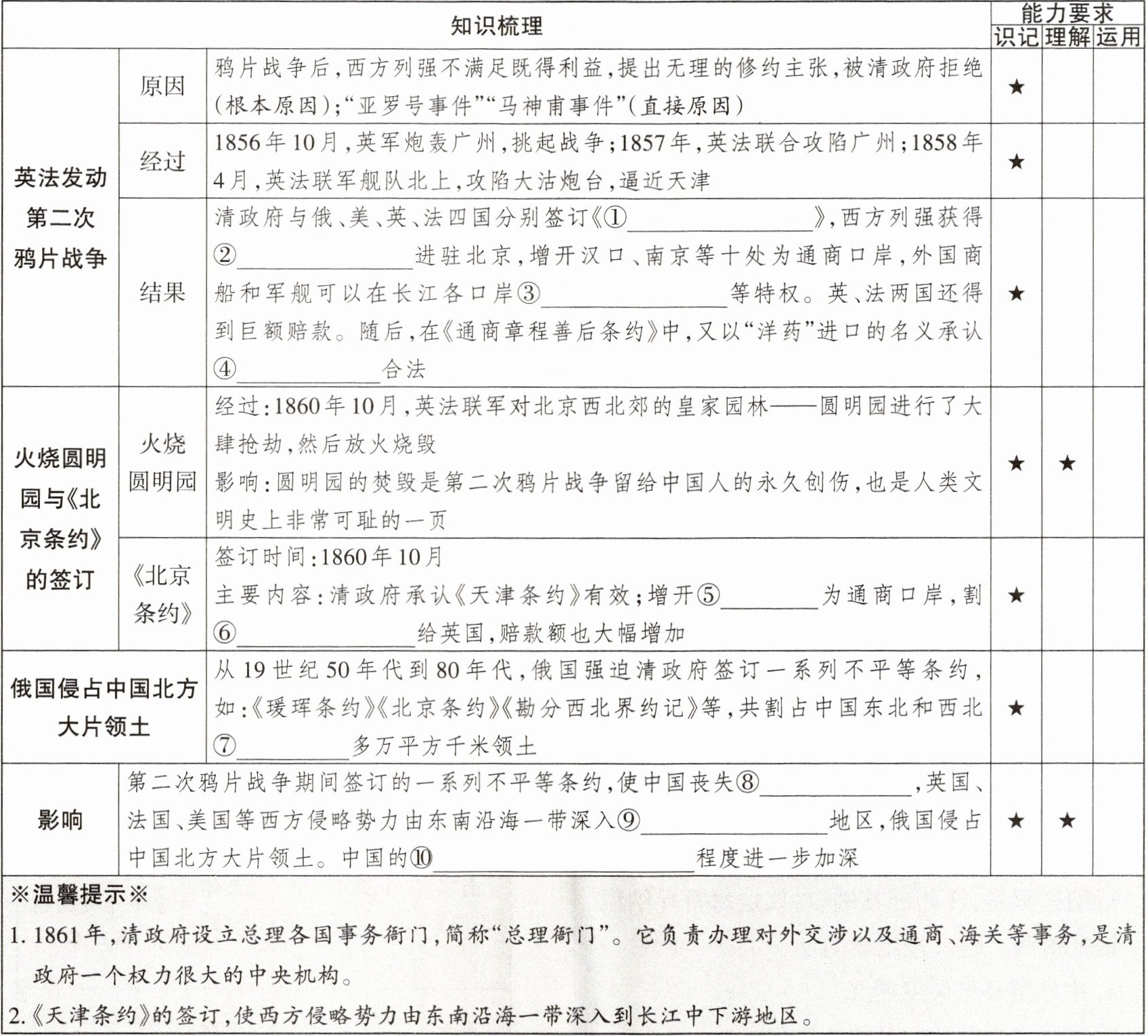 |影响| |第二次鸦片战争期间签订的一系列不平等条约,使中国丧失⑧______,英国、法国、美国等西方侵略势力由东南沿海一带深入⑨______地区,俄国侵占中国北方大片领土。中国的⑩______程度进一步加深|识记★|理解★| |