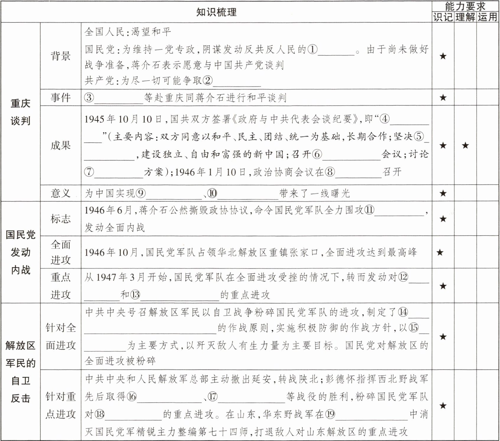 ①内战 ②和平 ③毛泽东 ④双十协定 ⑤避免内战 ⑥政治协商 ⑦和平建国 ⑧重庆 ⑨民主统一 ⑩和平建国 ⑪中原解放区 ⑫陕北解放区 ⑬山东解放区 ⑭集中优势兵力、各个歼灭敌人 ⑮运动战 ⑯青化砭 ⑰沙家店 ⑱陕北 ⑲孟良崮战役