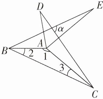 12. (几何直观·运算能力)如图,$\triangle ABE和\triangle ADC是\triangle ABC$分别沿着AB,AC边翻折$180^\circ$形成的,若$\angle 1:\angle 2:\angle 3= 28:5:3$,求$\angle \alpha$的度数.