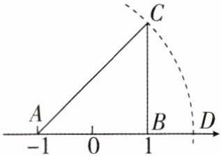 8. 如图,数轴上的点A表示的数是-1,点B表示的数是1,$CB\perp AB$于点B,且$BC= 2$,以点A为圆心,AC长为半径画弧交数轴于点D,则点D表示的数介于( )