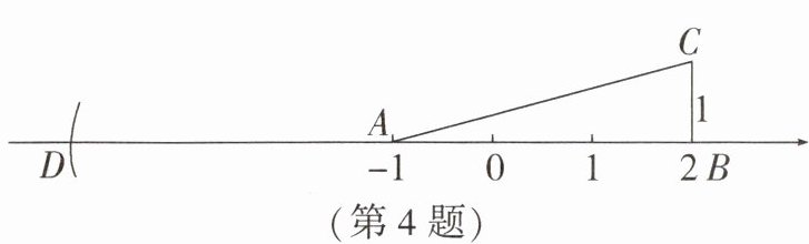 4. 如图,在Rt△ABC中,∠ABC= 90°,BC= 1.将AB边与数轴重合,点A,点B对应的数分别为-1,2.以点A为圆心,AC的长为半径画弧,交数轴于点D,则点D表示的数为______.
