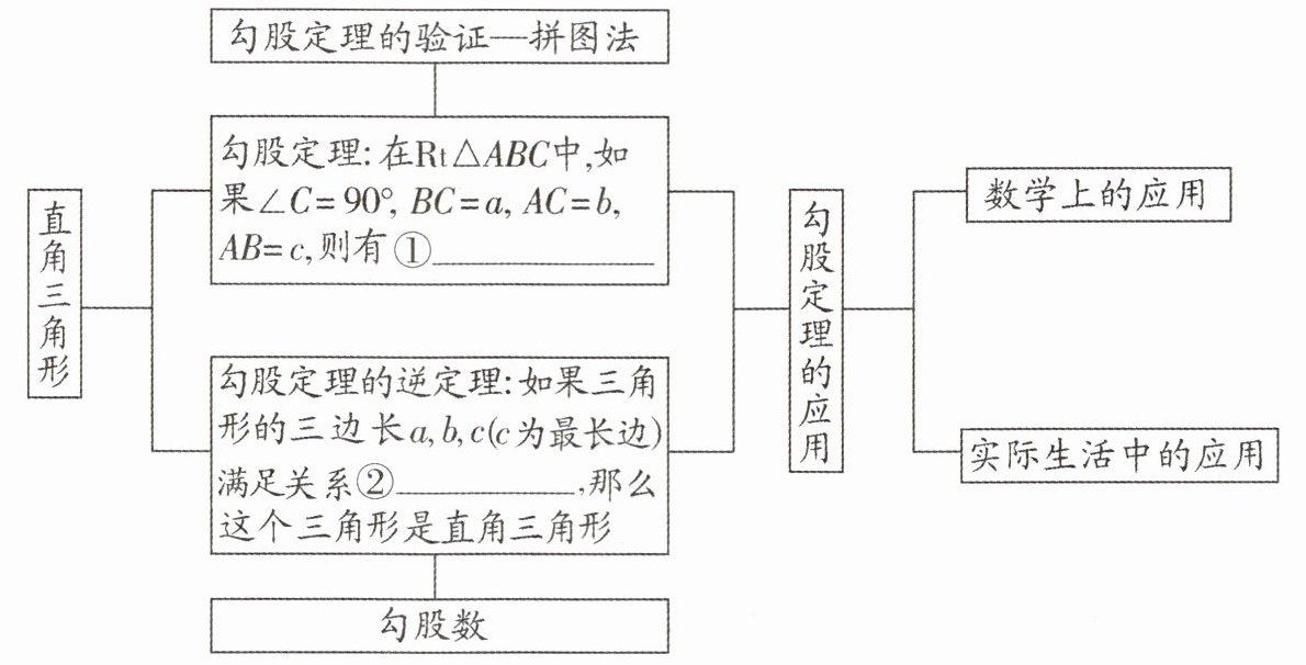 ├─勾股定理的逆定理:如果三角形的三边长a,b,c(c为最长边)满足关系②______,那么这个三角形是直角三角形