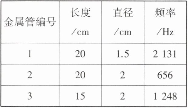 |金属管编号|长度/cm|直径/cm|频率/Hz|