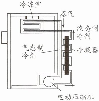 9. (2025·南京期末)兴趣小组的同学对电冰箱的制冷原理进行了跨学科实践.经过研究发现电冰箱利用制冷剂作为热的“搬运工”,制冷剂在电动压缩机的驱使下,在密封的管道内循环流动,将冰箱内的热量带到冰箱外,达到制冷的目的.