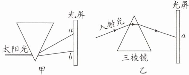 (1)如题图甲,光屏上形成一条彩色的光带,这说明白光由多种色光复合而成,经过三棱镜会发生色散现象;光的色散现象中,紫光的偏折程度最大,图甲中a处是紫光.