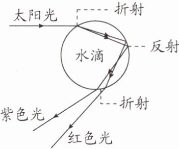 19. (2025·无锡期中)彩虹是光线以一定角度照在水滴上所发生的折射、反射、再折射等造成的大气光象,其形成原理如图所示,光线照射到雨滴后,在雨滴内会发生折射,各种颜色的光发生偏离,其中紫色光的折射程度最大,红色光的折射程度最小,其他各色光则介于两者之间,折射光线经雨滴的后缘内反射后,再经过雨滴和大气折射到我们的眼里,由于空气悬浮的雨滴很多,所以当我们仰望天空时,同一弧线上的雨滴所折射出的不同颜色的光线角度相同,于是我们就看到了多种色光组成的彩虹.光的三原色是红、______、绿,由图可知,太阳光经过水滴后形成彩虹,水滴能将太阳光分解成多种色光,说明太阳光是______(填“复色光”或“单色光”),从彩虹的形成原理图来看,人们所看到的彩虹是______(填“内紫外红”“内红外紫”或“各种色光随意排列”)