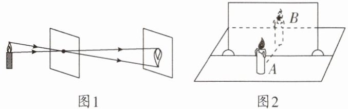 2. 图1 通过小孔在光屏上呈现蜡烛的像,说明小孔成的是______(填“实像”或“虚像”),图2 平面镜成的蜡烛像______(填“能”或“不能”)呈现在光屏上,平面镜成的是______(填“实像”或“虚像”),实像和虚像______(填“都能”或“不都能”)被人眼看见.