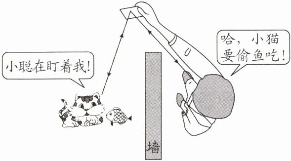 4. 如图所示是关于小猫和小聪的一幅漫画,图中两条光线的夹角是$60^\circ$,则小聪观察小猫光路的入射角是______,此现象说明在反射时,光路是______.