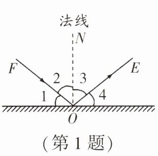 1. 如图为光在镜面上反射的光路图,法线ON垂直于______,根据光线的方向可以判断______是入射光线,入射角是______(填“$\angle 1$”“$\angle 2$”“$\angle 3$”或“$\angle 4$”),反射角与入射角大小______(填“相等”或“不相等”),入射光线、反射光线、法线在______.