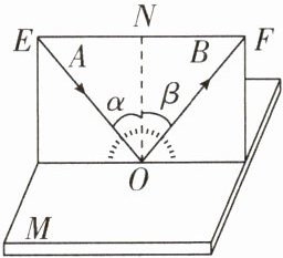 3. 如图所示,平面镜M水平放置,白色纸板竖直地立在平面镜上,纸板由A、B两部分组成,可绕接缝ON翻折.使一束光紧贴纸板A射向镜面上的O点,只有当纸板B翻折至图中位置时,才能观察到纸板B上呈现反射光线,可知反射光线、入射光线和法线在______,此时角度$\alpha为40^\circ$,则$\beta$为______,将一束光沿FO方向入射,则反射光将沿______方向射出.