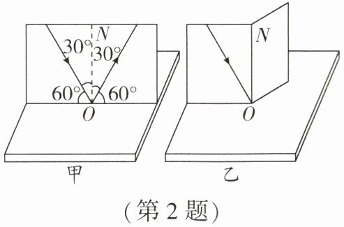 2. 在“探究光的反射规律”实验中,如图所示,反射角等于______(填“$30^\circ$”或“$60^\circ$”),若增大入射角,则反射角变______;若将右侧纸板向后转动,如图乙所示,在右侧纸板上______(填“能”或“不能”)观察到反射光.