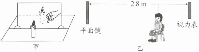 (3)检查视力的时候,视力表放在被测者的后上方,被测者识别对面墙上镜子里视力表的像.如图乙所示,视力表与平面镜间的水平距离为2.8 m,要求视力表在镜中的像与被测者相距5 m,则人应坐在离平面镜______m的位置检查.