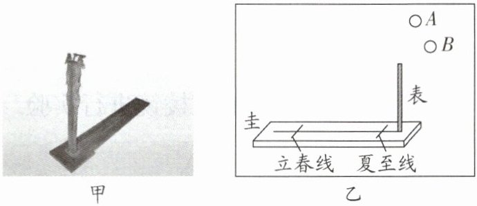 5. 圭表是中国古代重要的天文仪器,如图甲所示,圭表通过测量一年中每日正午时日影长度来推测二十四节气,形成日影的原理是______.圭表的原理如图乙所示,立春节气正午日影比夏至长,说明立春节气正午太阳在位置______(填“A”或“B”).