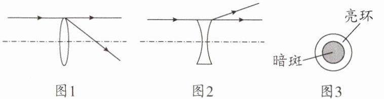 17. 小明在暗室里探究平行于主光轴的光通过透镜后的光路,他用一直径和透镜玻璃直径相同的平行光正对透镜照射,惊奇地发现通过透镜玻璃边缘的光经透镜后部分发生偏折,部分沿直线传播,如图1和2所示.第二天小明在阳光下继续研究透镜对光的作用,将透镜正对太阳光,移动与透镜平行的白纸,在白纸上得到了如图3所示的现象.则该同学所用的透镜为______(填“凹透镜”“凸透镜”或“凹透镜或凸透镜”);继续将白纸稍远离该透镜,则暗斑的面积将______(填“变大”“变小”或“不变”),亮环的亮度将______(填“变亮”“变暗”或“不变”).