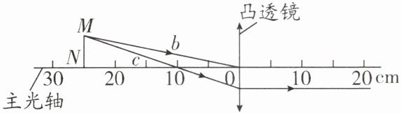 6. 如图,凸透镜的光心在0 cm处,物体MN上M发出的光线b经过光心,M发出的光线c经过凸透镜后的光线平行于主光轴.
