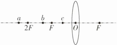 b 倒立 右 不能 解析:由图可知:a点在二倍焦距之外,成倒立、缩小的实像;b点在一倍焦距和二倍焦距之间,此时成倒立、放大的实像;c点在焦点之内,成正立、放大的虚像,不能在屏上显现,因此蜡烛在b点时,在凸透镜右侧光屏上成的像最大,像是倒立的;将蜡烛从a移到b,即物距减小,像距将变大,所以光屏向右移动.