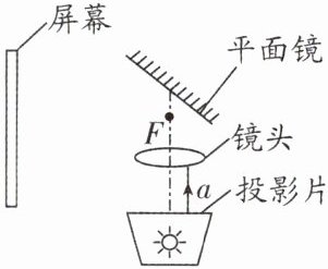 15. 如图所示是投影仪的成像原理.光线a平行于凸透镜主光轴,F为凸透镜的焦点.请在图中画出光线a经凸透镜折射后的光线、经平面镜反射到屏幕的光线.
