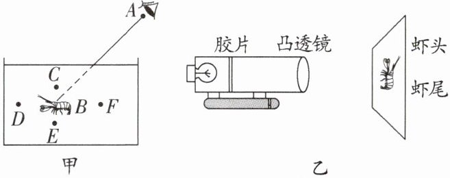 (1)如图甲所示,他看到B处的“虾”是因为光的______而形成的______像,真正的虾在水中______(填“C”“D”“E”或“F”)处.他用激光笔从A点向______(填“B”“C”“D”“E”或“F”)处射出光束即可把虾照亮.