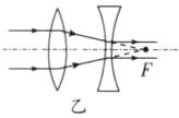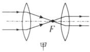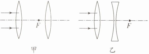 11. 如图,两组透镜的焦点都重合,请完成光路图,并指出甲、乙分别适用于何种类型的望远镜.